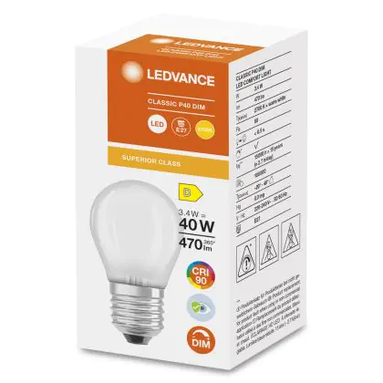 La Ledvance Superior Classic LED E27 Sferica Ghiaccio 3.4W 470lm - 927 Bianco Molto Caldo | Dimmerabile - Miglior resa cromatica è la perfetta sostituzione per la tua lampada convenzionale 40W con attacco E27 grazie alla sua tecnologia LED. Passare a LED ti offrirà tanti vantaggi!