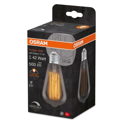 La Osram Vintage 1906 LED E27 Edison Filament Smokey 11W 500lm - 818 Extra Warm White | Dimmable è la perfetta sostituzione per la tua lampada convenzionale 42W con attacco E27 grazie alla sua tecnologia LED. Passare a LED ti offrirà tanti vantaggi!