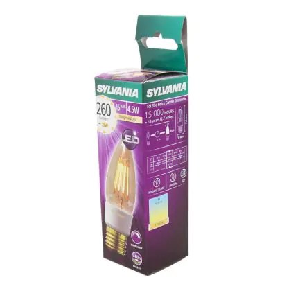 Questa lampadina rétro Sylvania a forma di candela è la soluzione ideale per un’illuminazione decorativa. Il design rétro con i filamenti interni visibili ricorda le vecchie lampadine ad incandescenza. È adatta per un'installazione su lampadari a bracci in salotti, ristoranti, bar e negozi per regalare all’ambiente un tocco di storia ed eleganza. La temperatura del colore caldissima da 1700 Kelvin favorisce un’atmosfera accogliente e rilassante. Grazie alla tecnologia LED integrata potrai approfittare di un risparmio significativo sui costi energetici e di manutenzione! Inoltre, consente di regolare l'intensità luminosa in base alle preferenze illuminazione. Questa lampadina, infatti, sostituisce le soluzioni da 25 W con attacco E27 consumando solo 4.5 W. Presenta un ciclo di vita fino a 40 volte più lungo rispetto ad una lampadina ad incandescenza e diversamente dalle lampade a risparmio energetico offre un’accensione istantanea fino al massimo della potenza. Inoltre, costituisce un’ottima alternativa ecologica in quanto non contiene materiali pericolosi per il nostro organismo e per l’ambiente.